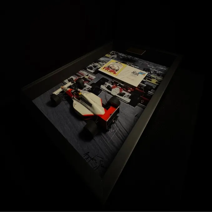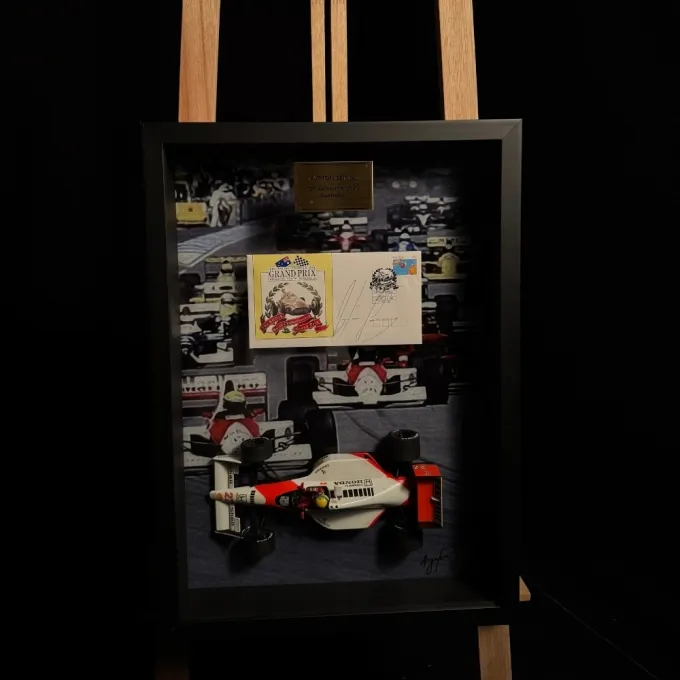 Este quadro exclusivo reúne duas relíquias: uma miniatura Minichamps na escala 1:18 e um raro envelope original do GP da Austrália de 1990, autografado por Ayrton Senna.