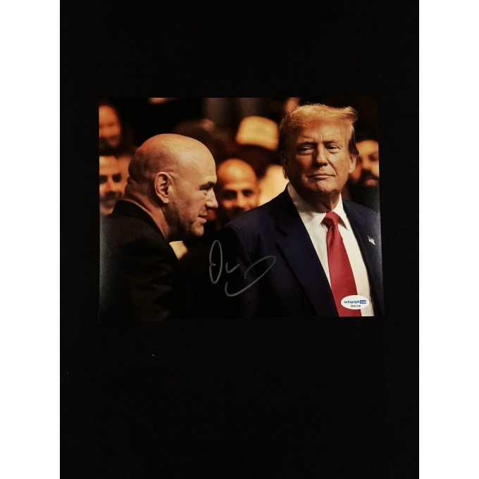 Desde que assumiu a presidência do Ultimate Fighting Championship em 2001, Dana White liderou a profissionalização do MMA, firmou contratos multimilionários com emissoras e patrocinadores, regulamentou o esporte em vários países e criou eventos históricos que revelaram e consolidaram campeões como Anderson Silva, Georges St-Pierre, Khabib Nurmagomedov, Amanda Nunes e Conor McGregor. Sob sua gestão, o UFC se tornou a principal liga de artes marciais mistas do mundo, hoje avaliada em bilhões de dólares. Peça exclusiva de alto padrão para colecionadores e fãs do MMA. Fotografia oficial assinada de próprio punho por Dana White, empresário norte-americano que transformou o UFC de um torneio quase marginalizado em um império esportivo global. Item certificado pela ACOA garantindo 100% de autenticidade.