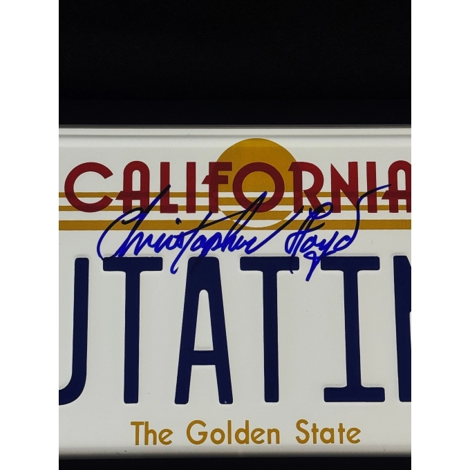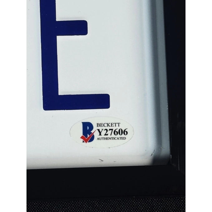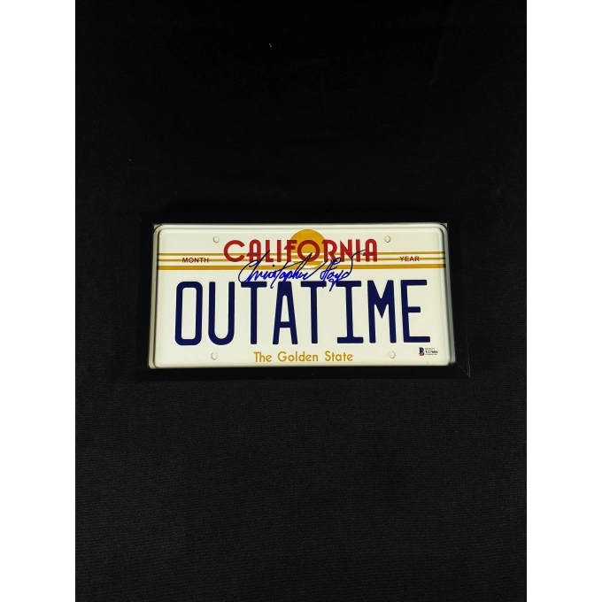 Peça icônica diretamente do universo de De Volta para o Futuro. Esta placa, réplica da lendária placa do DeLorean, é autografada por Christopher Lloyd, o inesquecível Doc Brown, símbolo da imaginação, ciência e aventura que marcaram gerações. Certificada pela Beckett Authentication Services (BAS).