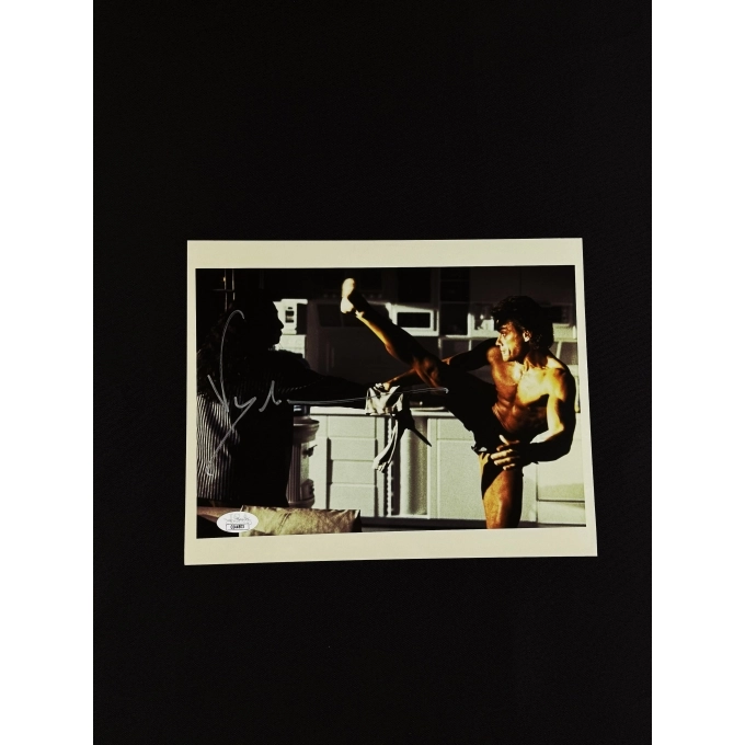 Jean-Claude Camille François Van Varenberg ou Van Damme se tornou um ícone dos filmes de ação nos anos 1980 e 1990, com sucessos que incluem O Grande Dragão Branco (Bloodsport), Kickboxer, Soldado Universal e Timecop. Conhecido por sua impressionante habilidade em artes marciais e pelo carisma nas telas, Van Damme popularizou o cinema de artes marciais no ocidente, tornando-se referência para fãs do gênero em todo o mundo.O item em questão é uma foto do filme TIMECOP, ficção científica e ação dirigido por Peter Hyams, estrelado por Jean-Claude Van Damme. O enredo gira em torno de uma polícia especializada em viagens no tempo, Max Walker (Van Damme), trabalha para uma divisão governamental que monitora viagens temporais ilegais.