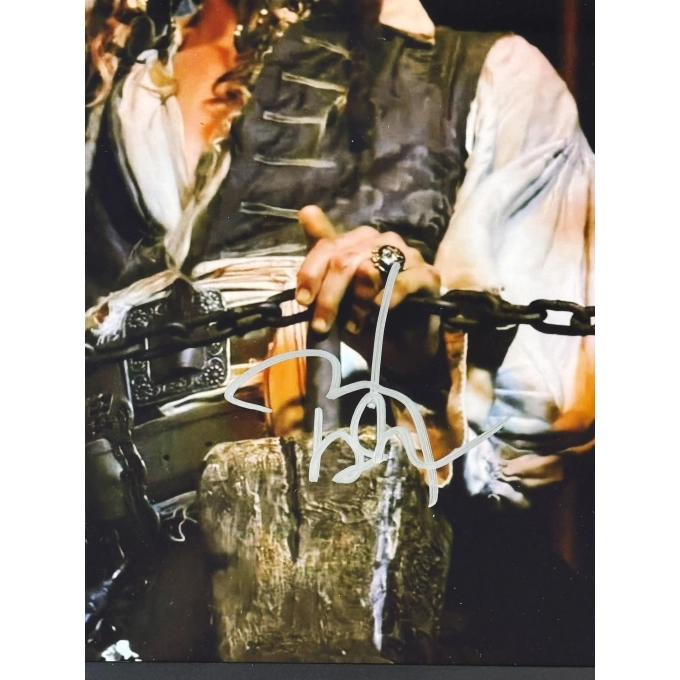 Poster autografado por Johnny Depp caracterizado como Captain Jack Sparrow, personagem que o consagrou mundialmente e marcou uma das franquias mais icônicas do cinema moderno.