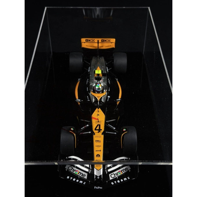 Esta réplica impecável detalha o chassi que recolocou a McLaren na briga direta pelos pódios. O modelo apresenta a icônica pintura "Papaya" combinada com o preto fibra de carbono e o destaque especial para os logotipos da Chrome (Google), que remetem às clássicas liveries prateadas da equipe. Cada detalhe, desde os complexos sidepods até a asa traseira com patrocínio da OKX, foi reproduzido com precisão cirúrgica.