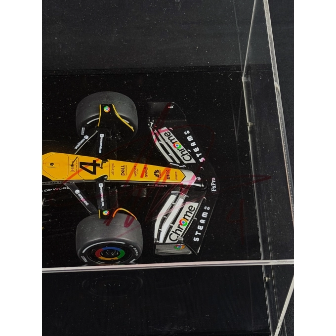 O diferencial exclusivo desta peça é o autógrafo original de Lando Norris, realizado com caneta permanente vermelha/alaranjada diretamente na lateral do case de acrílico. A escolha da cor da assinatura harmoniza perfeitamente com a identidade visual da McLaren, criando uma peça de exibição coesa e de alto valor agregado.