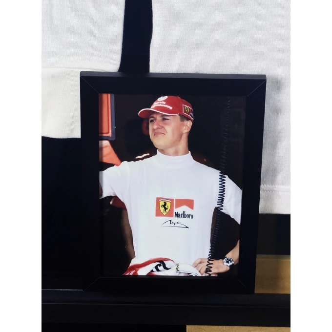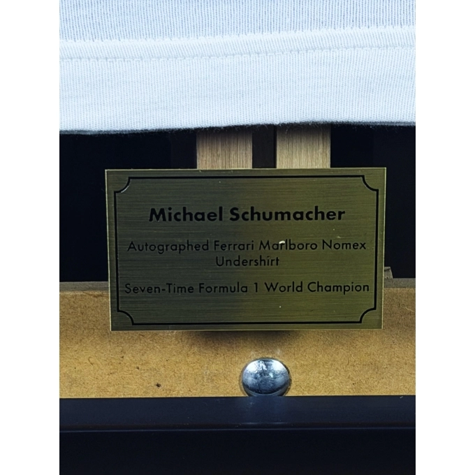 O verdadeiro ponto de distinção é a assinatura autêntica e perfeitamente preservada de Michael Schumacher, feita à mão em caneta preta logo abaixo dos logotipos. É uma marca de autenticidade que eleva esta peça a um item de curadoria de elite, conectando diretamente o colecionador ao heptacampeão mundial.