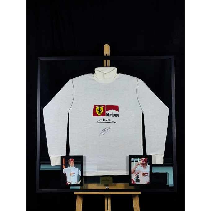 Reviva a era mais dourada e dominante da Scuderia Ferrari na Fórmula 1 com esta peça central de coleção inigualável. Esta undershirt (segunda pele) técnica de gola alta da Ferrari, autografada pessoalmente pela lenda Michael Schumacher, é um testemunho tangível de um legado de vitórias e recordes.