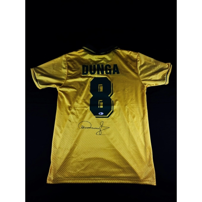 Uma camisa autografada por Dunga não é só memorabilia — é a assinatura do homem que personifica a palavra capitão no futebol brasileiro, um ícone de entrega, comando e mentalidade vencedora.