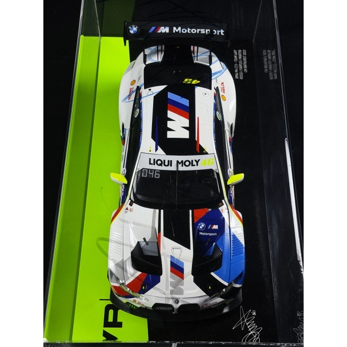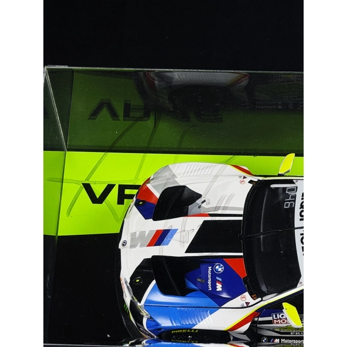O modelo é apresentado em case acrílico expositivo e recebe autógrafos aplicados por Rossi e Farfus no conjunto, ampliando de forma significativa sua relevância histórica e colecionável. O icônico número 46 aparece integrado ao layout oficial BMW Motorsport, conectando a identidade visual de Rossi à tradição competitiva da marca alemã e ao programa conduzido pela Team WRT.