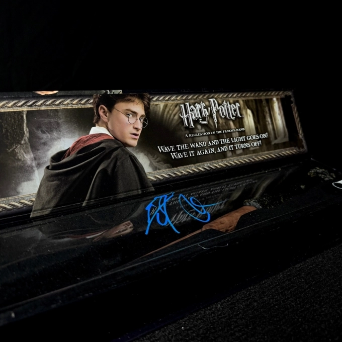 Um toque de magia para sua coleção ✨ Varinha iluminada autografada por Daniel Radcliffe, o eterno Harry Potter ⚡ Item assinado pelo próprio protagonista da saga que marcou gerações.